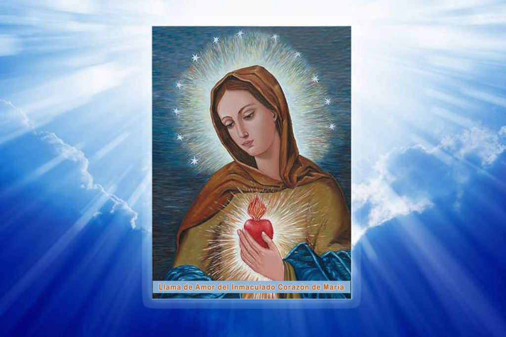 “Dios te salve, María, llena eres de gracia, el Señor es contigo, bendita Tú entre las mujeres y bendito el fruto de tu vientre, Jesús. Santa María, Madre de Dios, ruega por nosotros pecadores, y derrama el efecto de gracia de tu Llama de Amor sobre toda la humanidad, ahora y en la hora de nuestra muerte. Amén.”